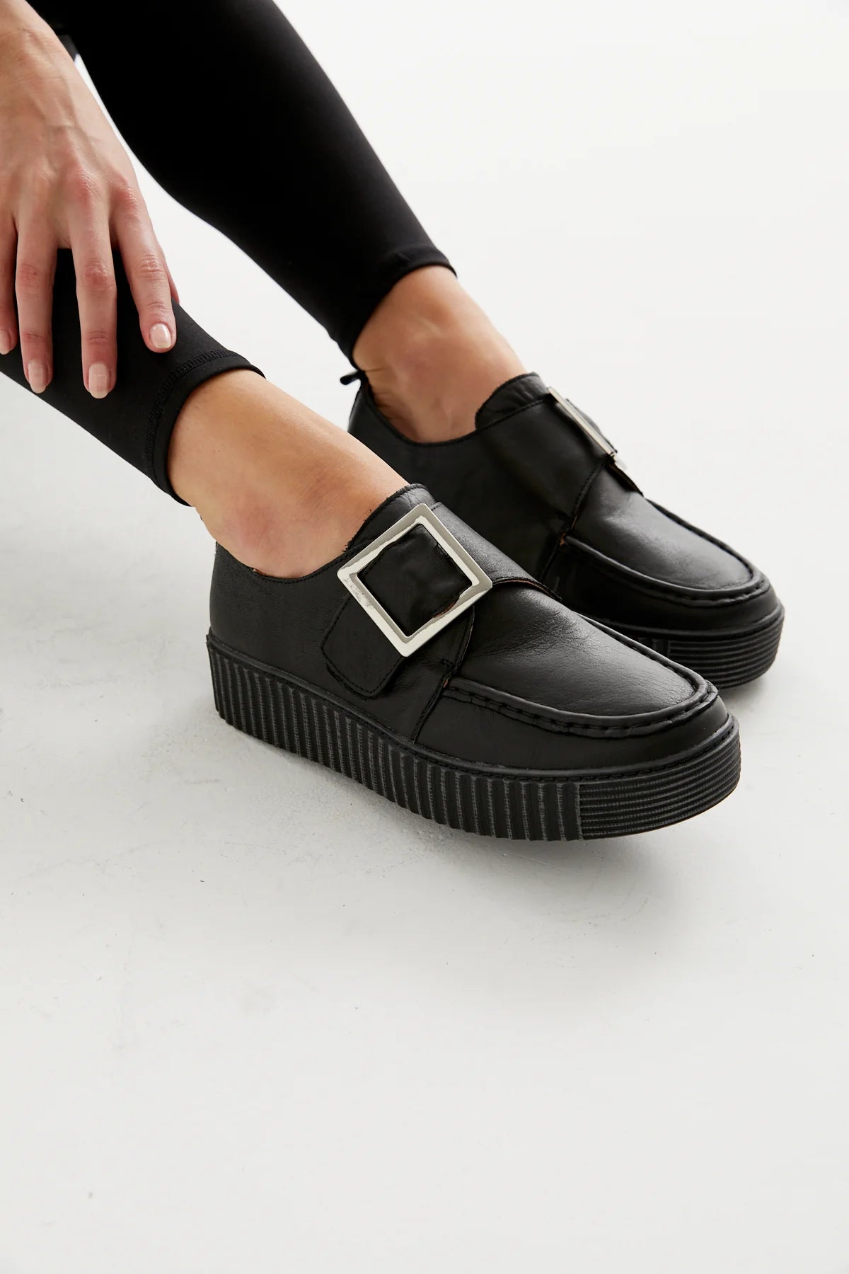 A creeper rubber sole combining a removable innersole, Velcro strap, apron front design and feature square metallic trim. Designed with a black coloured sole and a matching black leathered upper.